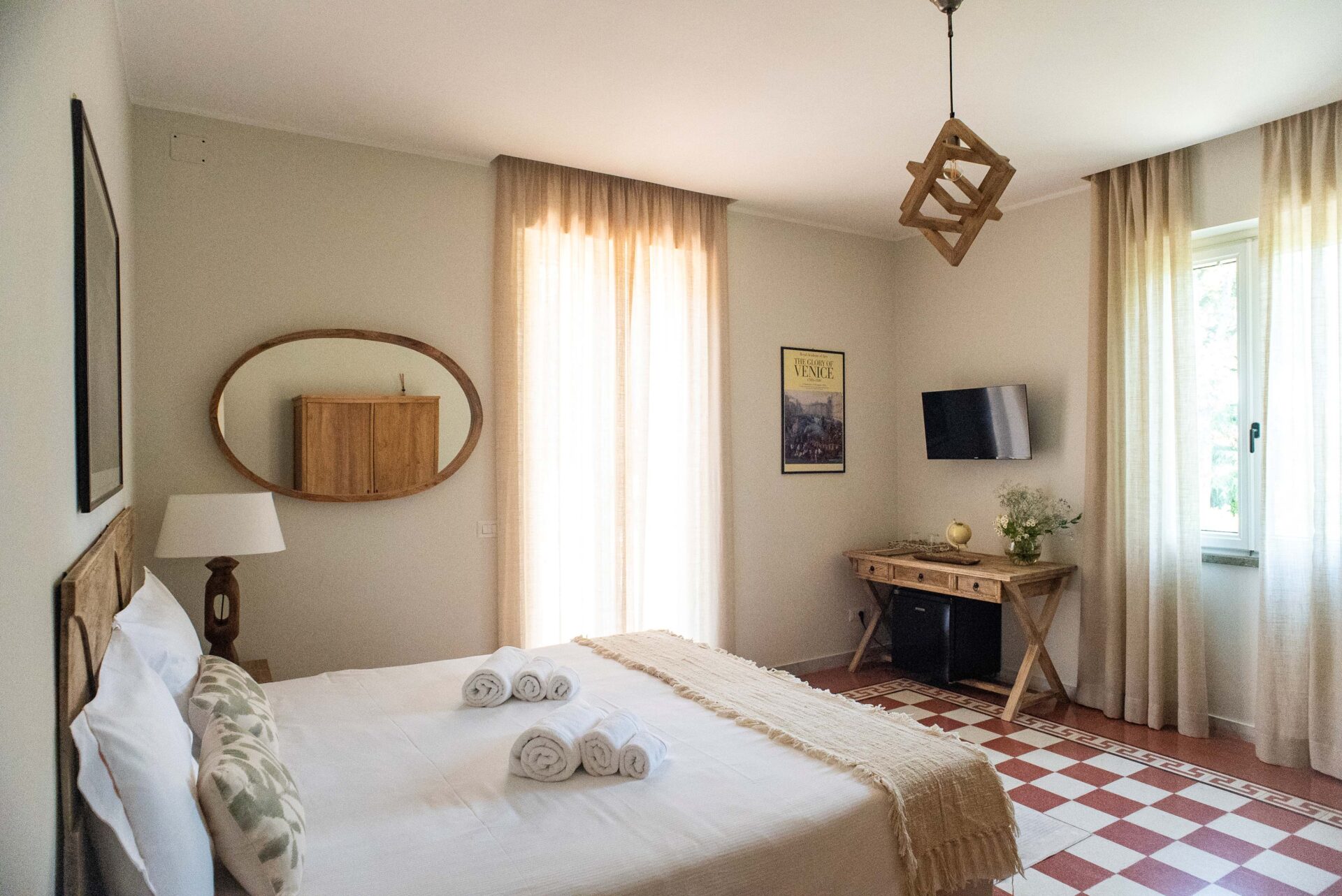 Qui, ogni dettaglio è pensato per trasformare il vostro soggiorno in un'esperienza indimenticabile. Immaginatevi circondati da un'atmosfera di pura eleganza, con un ampio letto king size che vi accoglie in un abbraccio di comfort dopo una giornata emozionante. Il bagno spazioso aggiunge un tocco di lusso con la sua ampia doccia e finiture di pregio. Ma la vera bellezza di Suite Glori si rivela con l'accesso diretto al terrazzo panoramico, dove potrete godervi la vista mozzafiato e lasciarvi avvolgere dalla serenità del panorama circostante.