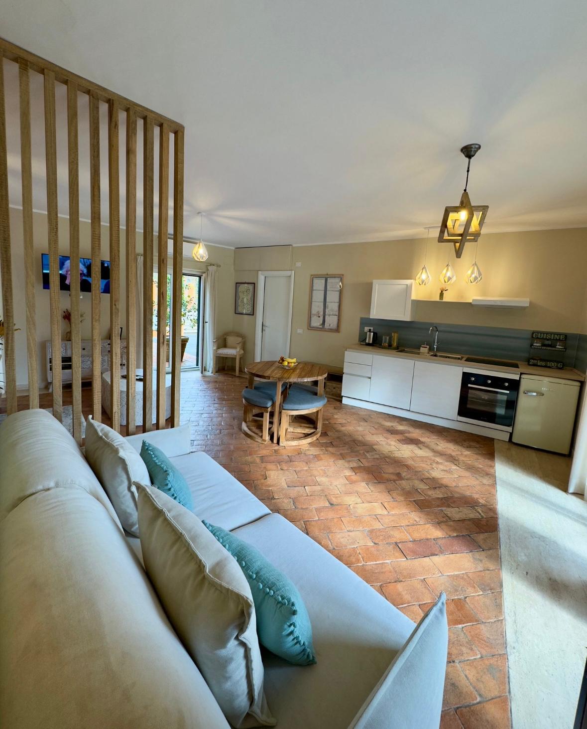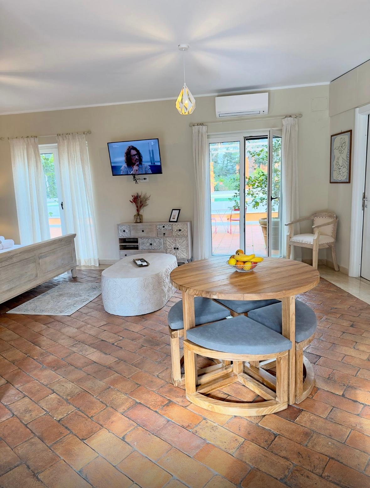 Qui troverai tutto ciò di cui hai bisogno per un soggiorno perfetto: zona living luminosa e accogliente con cucina attrezzata e divano letto alla francese, zona notte con lussuoso letto matrimoniale king size e bagno privato dotato di tutti i comfort. Completano la tua esperienza di soggiorno aria condizionata, smart TV, Wi-Fi gratuito, biancheria per il letto e il bagno, il parcheggio gratuito e l'accesso esclusivo alla nostra incantevole piscina. Non vediamo l'ora di farti sentire come a casa tua qui a Torlonia.